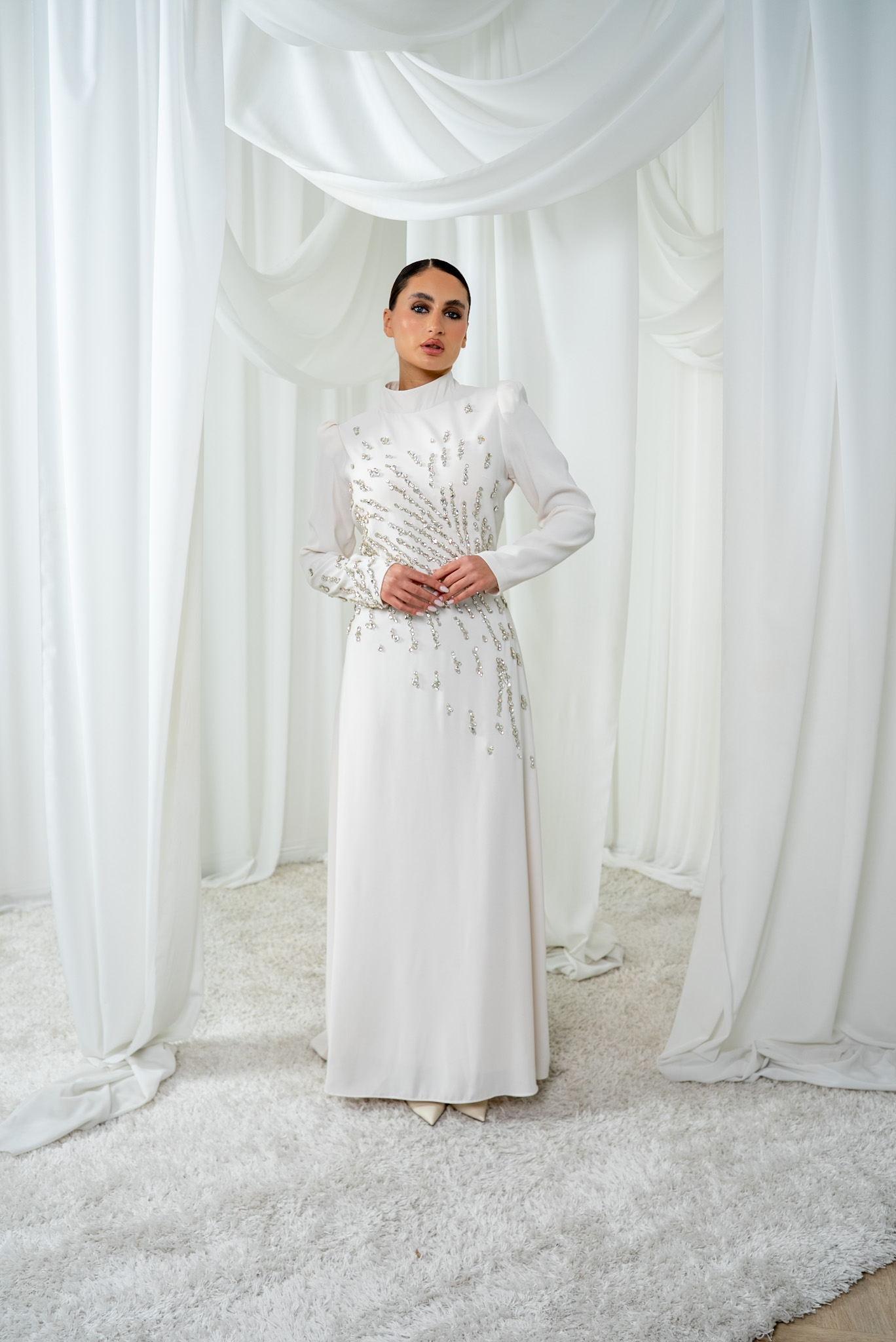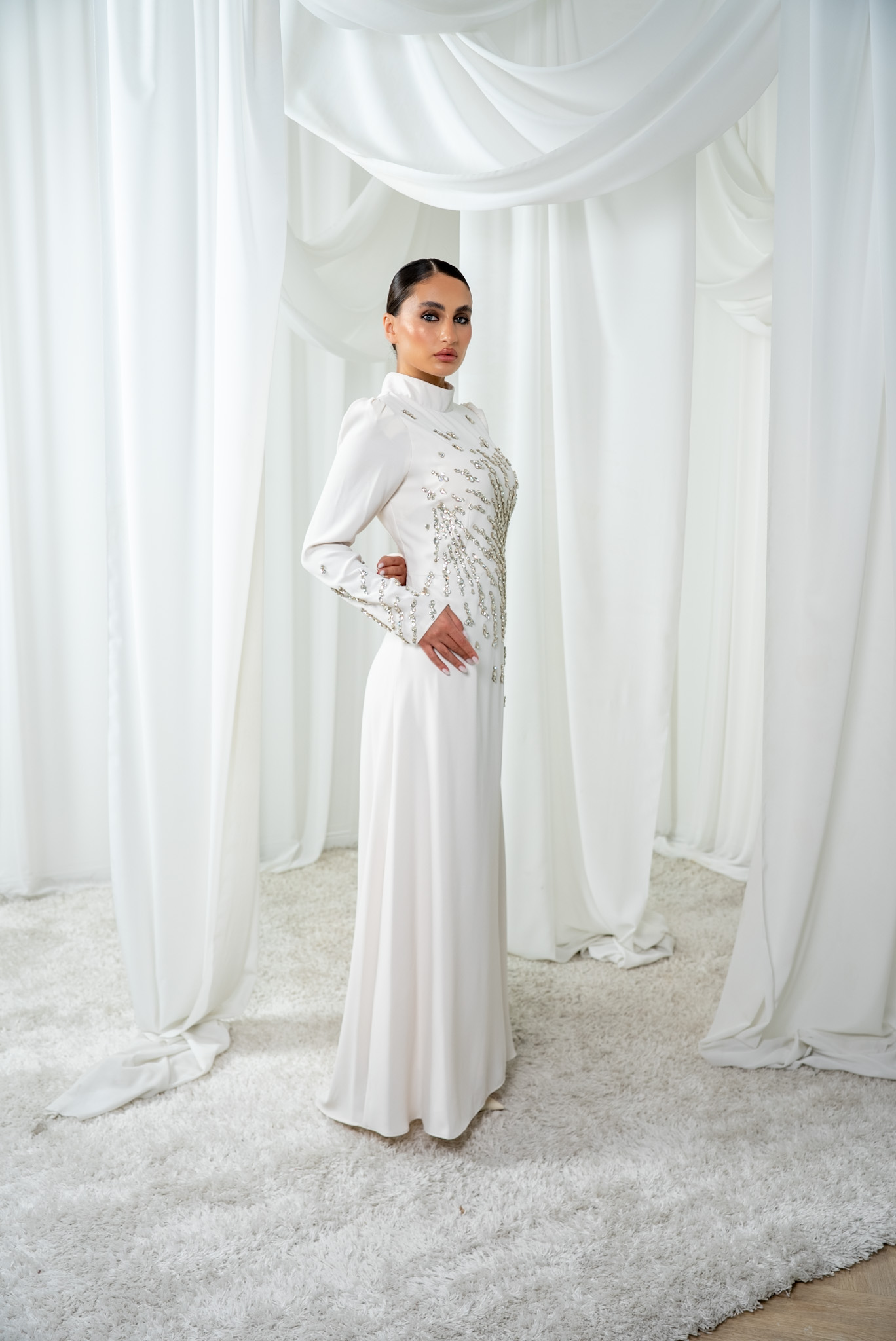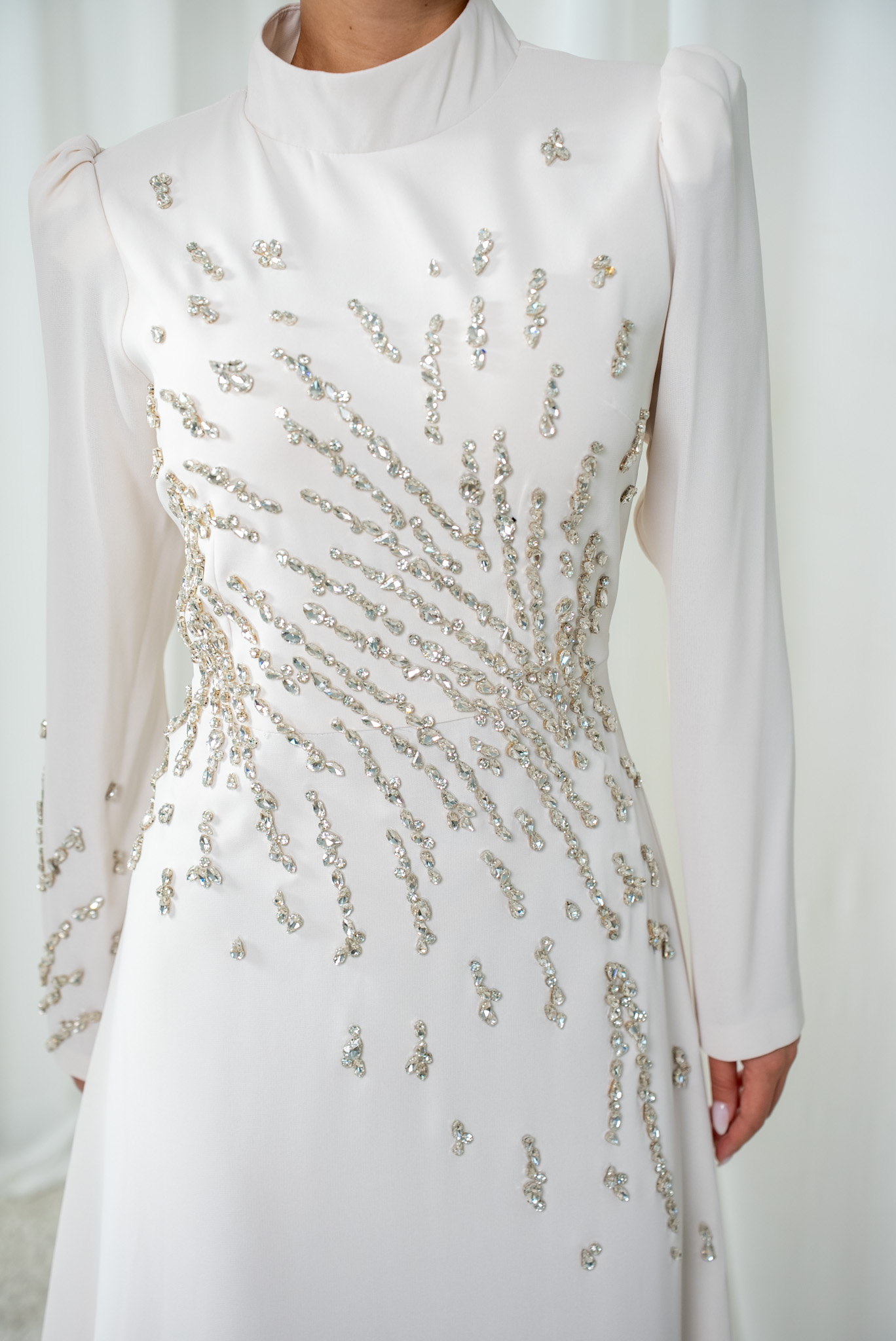 A modest white gown with silver embellishments and a clean, elegant silhouette. Ideal for special moments.
