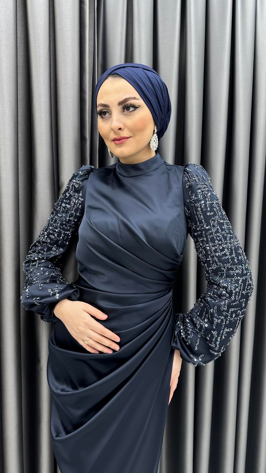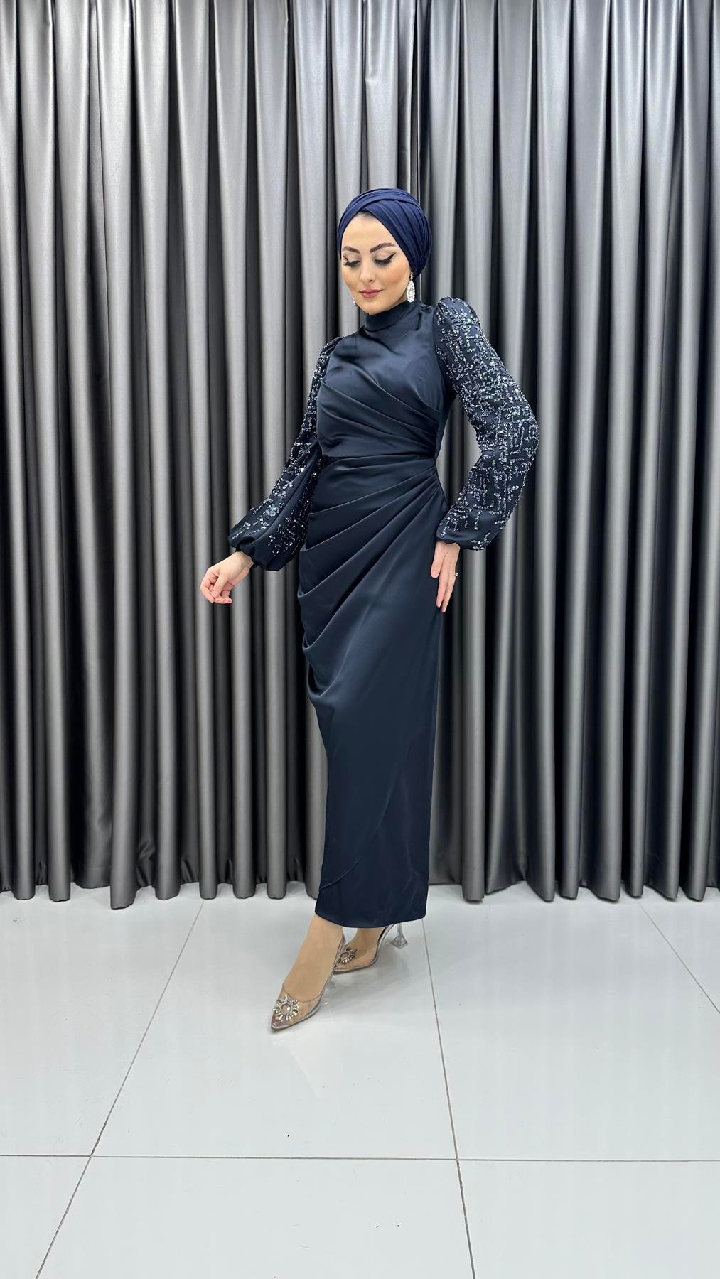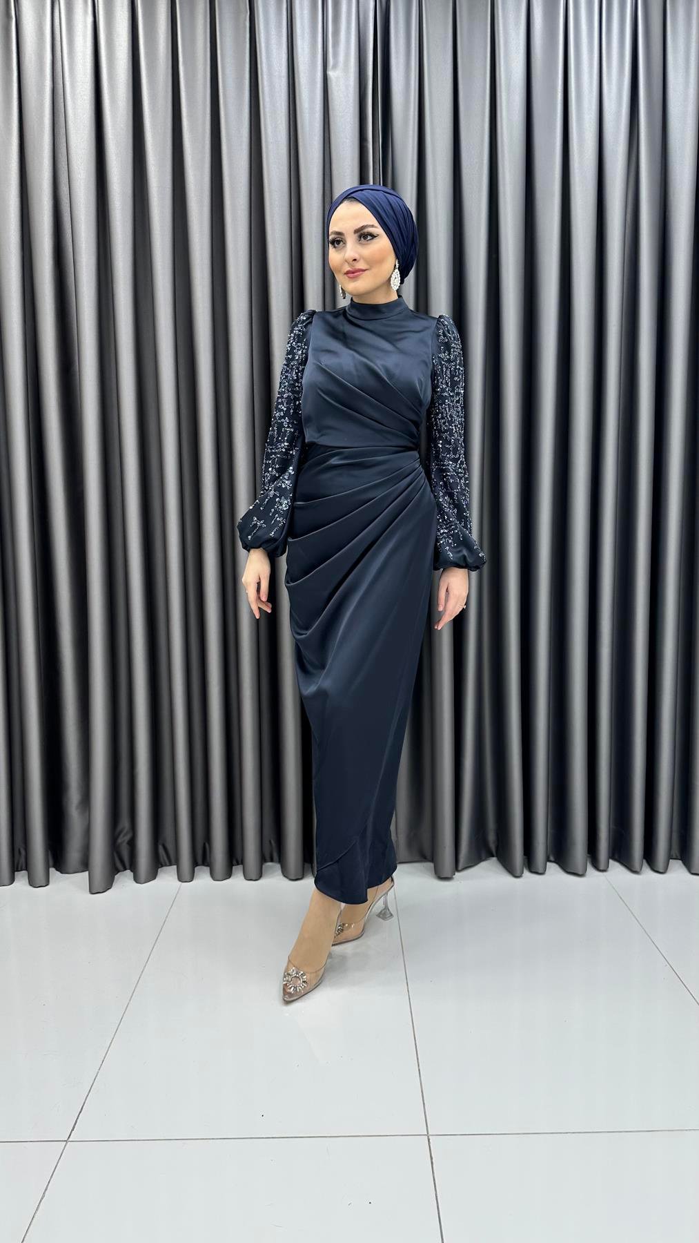 Elegant navy blue evening gown with draped details and sequined lace sleeves.