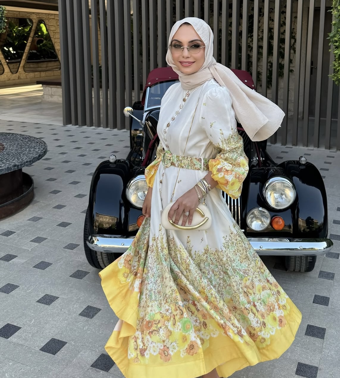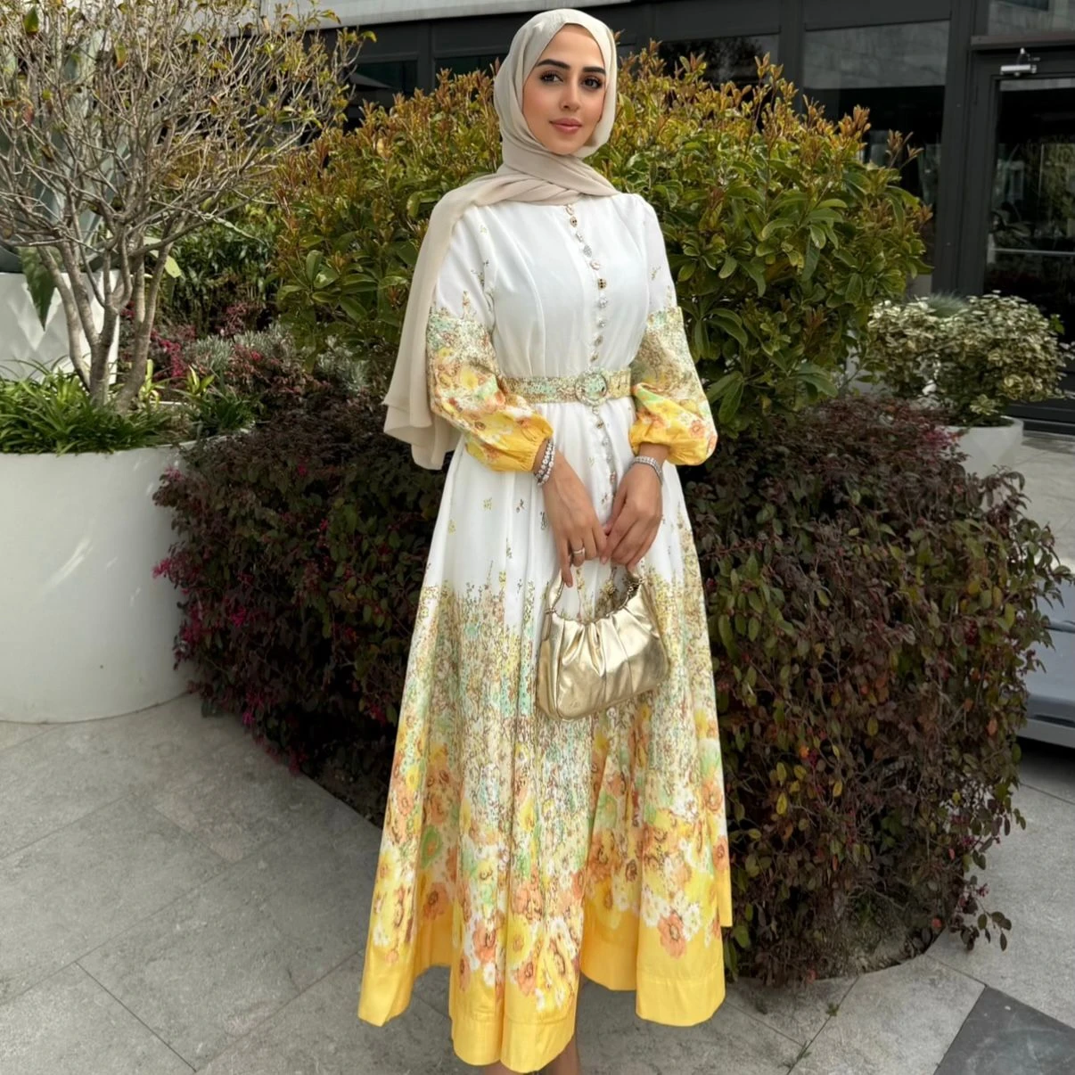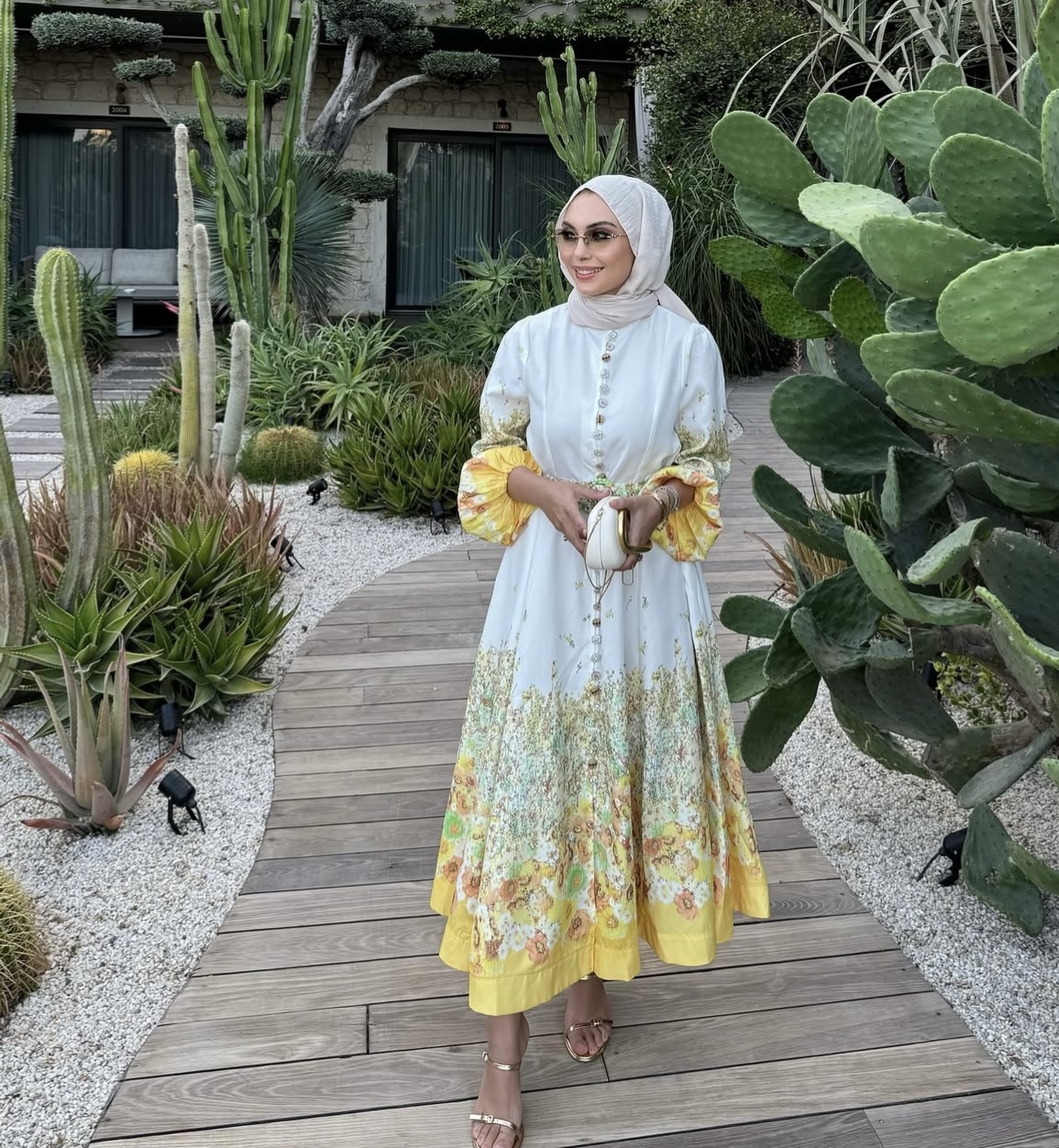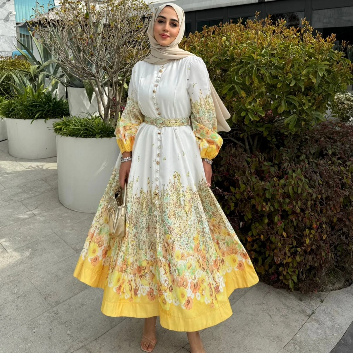 Floral belted dress with soft yellow tones, puff sleeves, and a flowy A-line silhouette — perfect for sunny days.